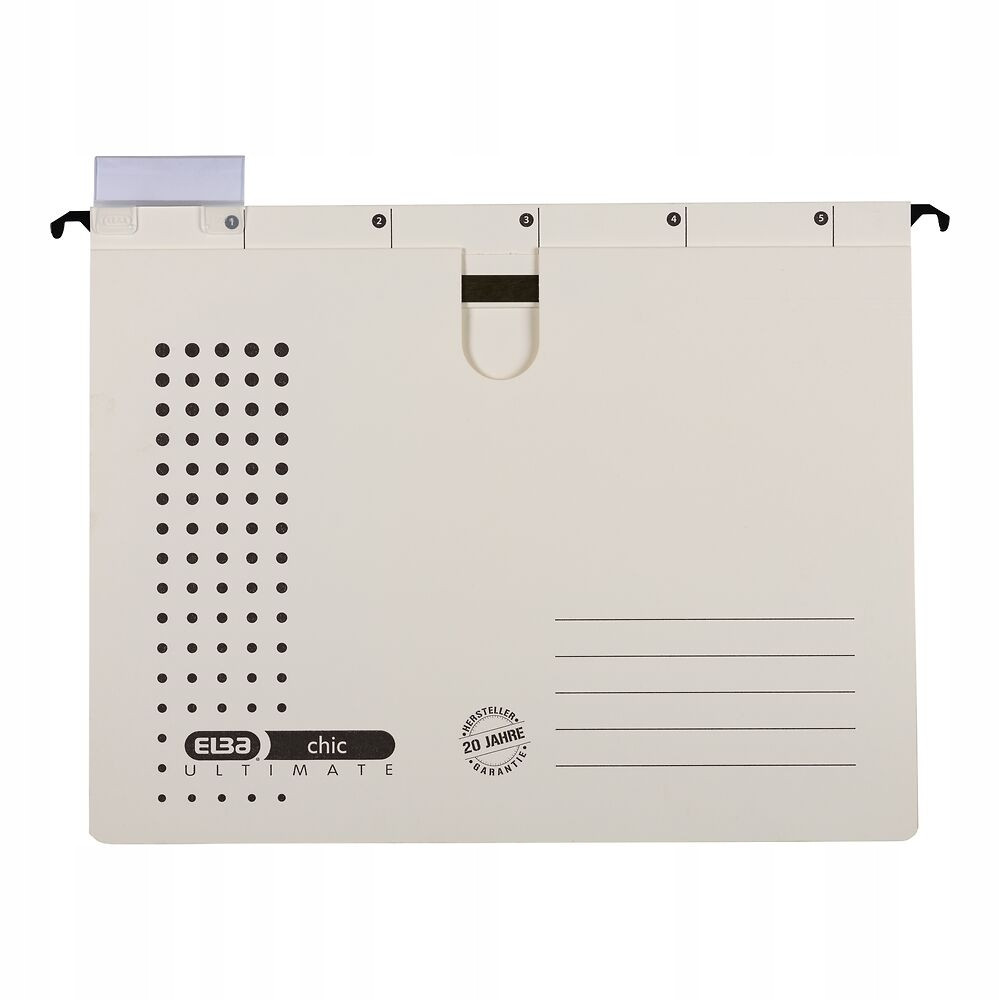 Skoroszyt zawieszkowy wykonany z mocnego kartonu. W zestawie przesuwny szyldzik z wymienną etykietą opisową.