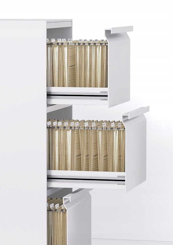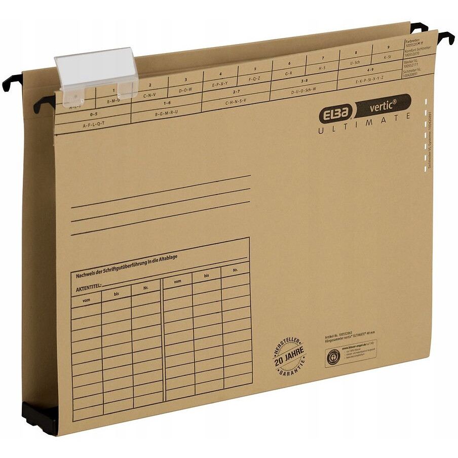 Teczka zawieszkowa wykonana z mocnego kartonu w bezowym kolorze. Dno o szerokości 4 cm pozwala pomieścic do 380 kartek. Na dnie teczki znajduje sie plastikowa wkladka z bocznymi ogranicznikami, zabezpieczającymi dokumenty przed wypadaniem.