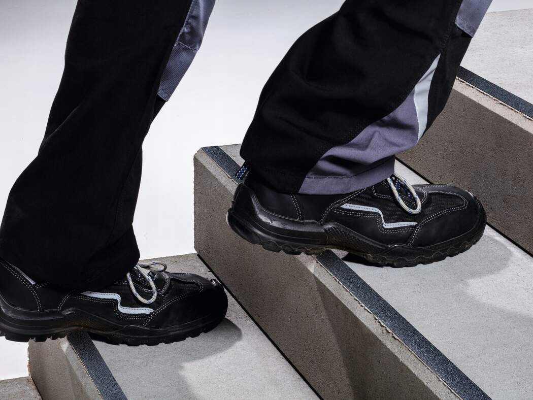 Antypoślizgowa taśma samoprzylepna o gruboziarnistej powierzchni do zwiekszenia bezpieczenstwa traktów komunikacyjnych na powierzchniach przemyslowych.