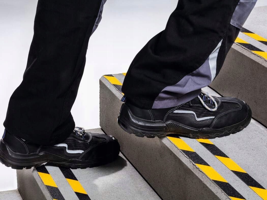 Antypoślizgowa taśma samoprzylepna o gruboziarnistej powierzchni do zwiekszenia bezpieczenstwa traktów komunikacyjnych na powierzchniach przemyslowych.