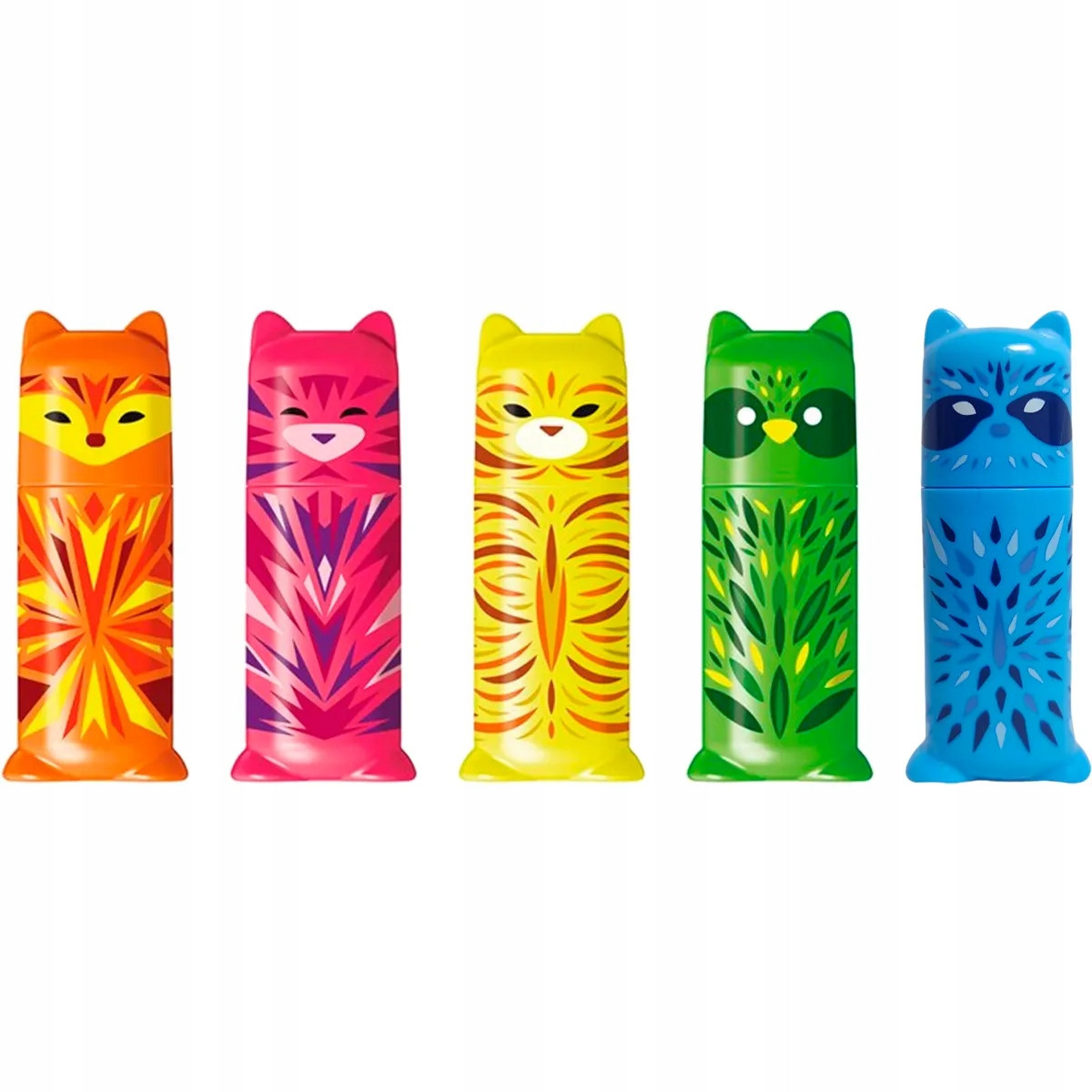 Zakreślacze mają zaokrąglony ksztalt obudowy z zatyczką w ksztalcie zwierząt, z wesolymi i kolorowymi wzorami.