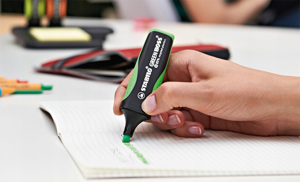 Zakreślacz STABILO lączy w sobie wysoką jakośc oraz zrównowazone podejście do korzystania z zasobów naturalnych - dzieki temu stanowi idealną propozycje dla konsumentów, którym lezy na sercu dobro planety. Stworzony w 83% z plastiku pochodzącego z recyklingu.