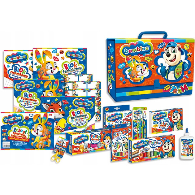 Wyprawka szkolna malego artysty BAMBINO zawiera najpotrzebniejsze materialy plastyczne spakowane w praktyczną teczke z rączką o wymiarach 33 x 24,8 x 9 cm.