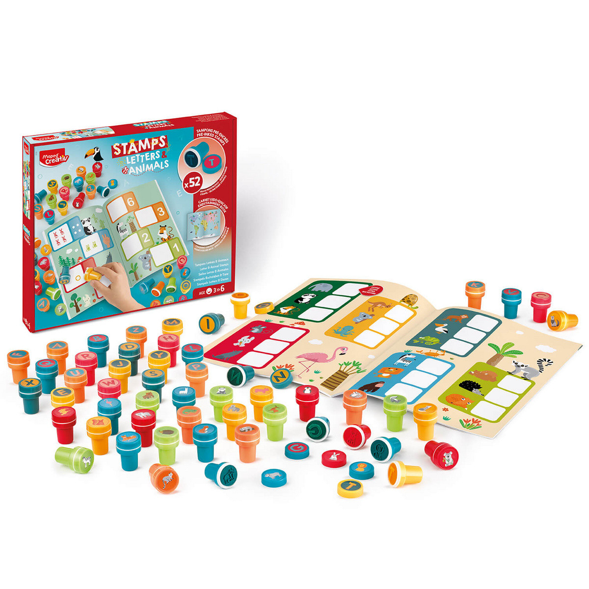 Zabawny i edukacyjny, kreatywny zestaw do nauki liczenia, odkrywania alfabetu i świata zwierząt z pieczątkami w różnych kolorach!