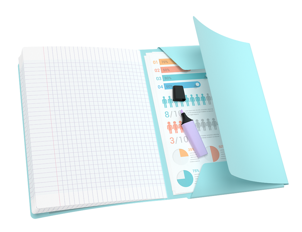 Na przodzie zeszytu bardzo praktyczna kieszen na luLne kartki, natomiast na koncu zeszytu teczka na dokumenty, której skrzydlo sluzy równiez jako zakladka.